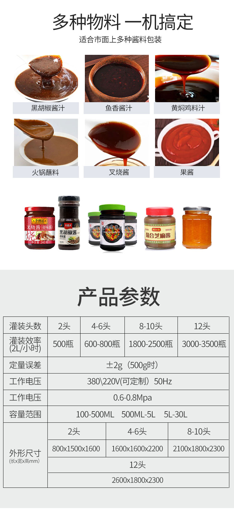 全自動(dòng)醬汁灌裝機(jī)可實(shí)時(shí)根據(jù)不同產(chǎn)品做出不同的調(diào)整,操作方便,內(nèi)置各種配方一鍵保存讀取。傻瓜式操作界面。