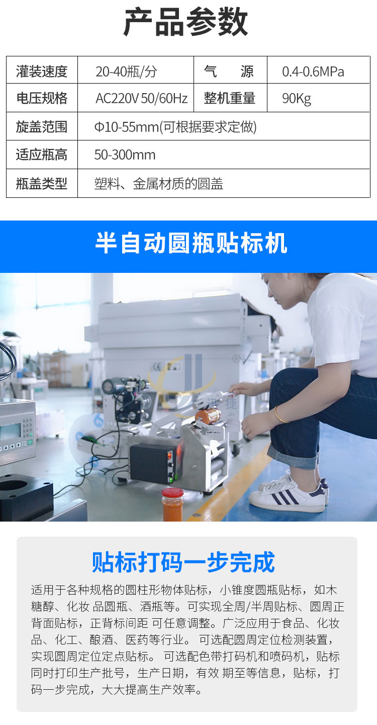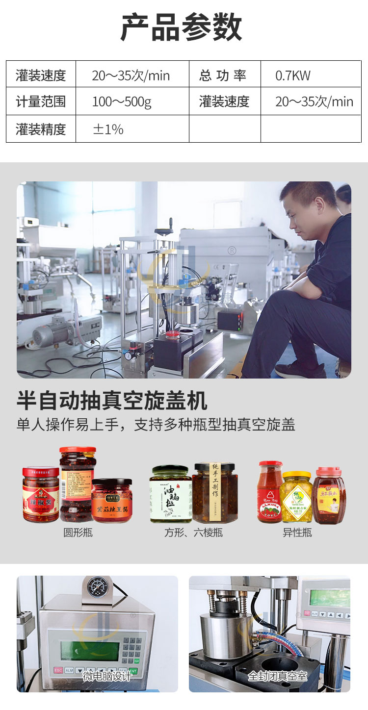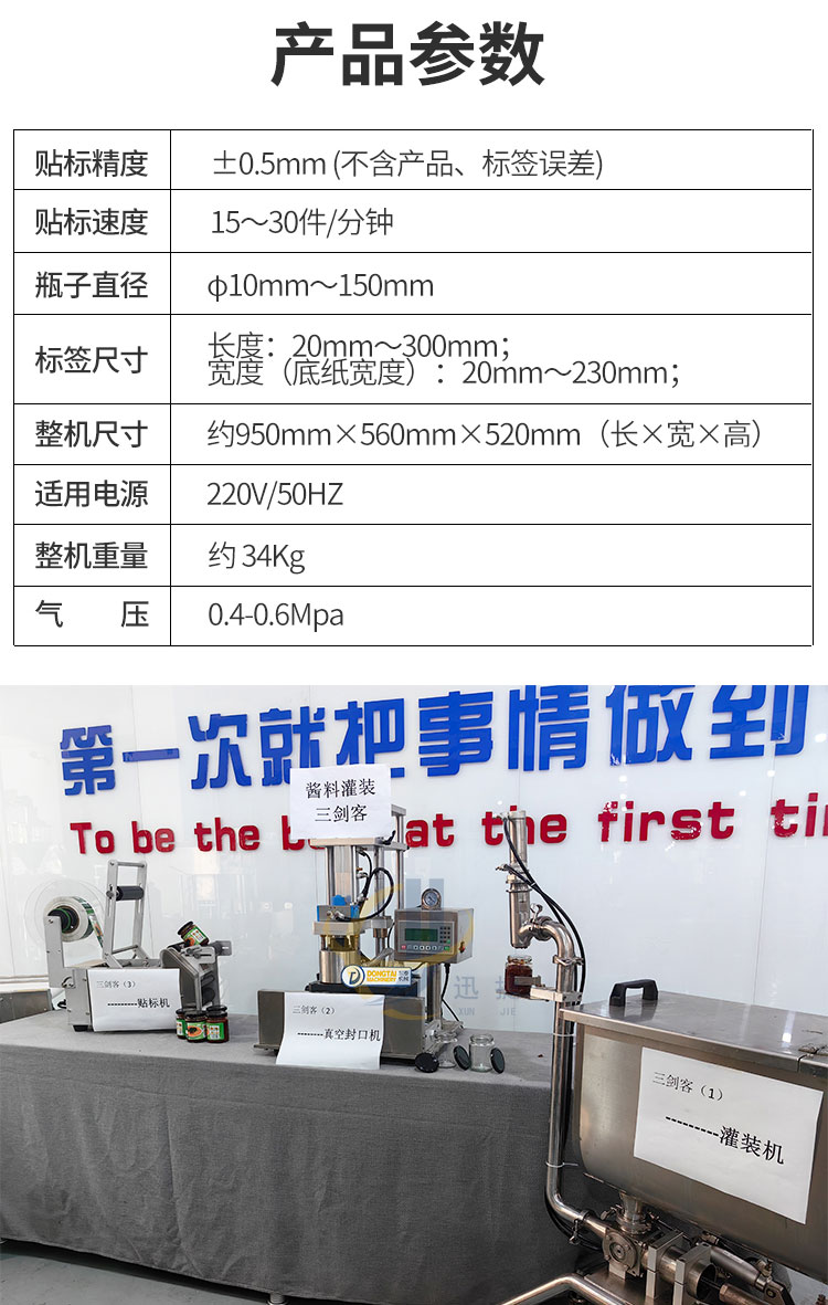 小型醬料灌裝生產(chǎn)線又名醬料灌裝三劍客,由半自動(dòng)醬料灌裝機(jī)+半自動(dòng)真空旋蓋機(jī)+半自動(dòng)圓瓶貼標(biāo)機(jī)組合而成。