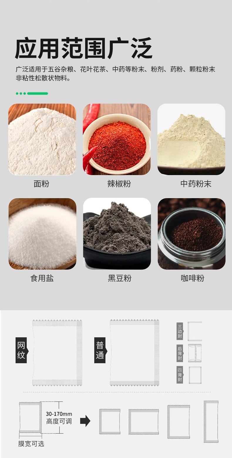 粉劑包裝機比較適用于豆奶粉、辣椒粉、奶粉、咖啡面粉、面粉等物品的計量包裝。與此同時還可以包裝淀粉、奶粉、食用鹽、中藥粉末、調(diào)味品、黑豆粉、預(yù)混料、飼料、酶制劑等。粉劑包裝機包裝材料:BOPP薄膜、紙/聚乙烯、玻璃紙/聚乙烯、聚酯/鍍鋁/聚乙烯、聚酯/聚乙烯、茶葉濾紙等可熱封復(fù)合包裝材料。