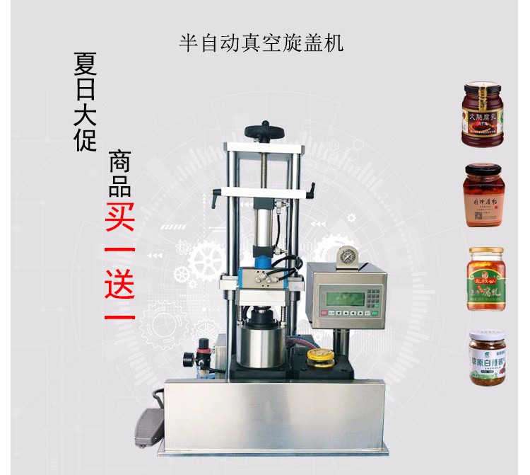 這款小型辣椒醬封口機(jī)主要用于食品包裝,采用標(biāo)準(zhǔn)馬口鐵爪式旋開蓋封口的玻璃瓶包裝。可實(shí)現(xiàn)的功能是抽吸包裝容器內(nèi)的空氣使其達(dá)到設(shè)定的負(fù)壓值(即抽真空),然后旋緊蓋子。 為半自動機(jī)型,即人工進(jìn)出瓶,人工配蓋,其他過程自動。